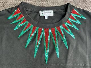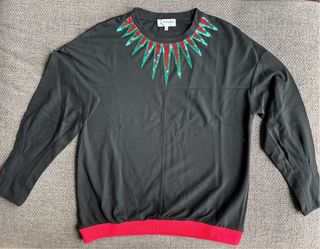 Sudadera de manga larga con un diseño llamativo en el cuello. - Detalle de lentejuelas rojas y verdes en forma de pico alrededor del cuello. - Puños y bajo elásticos. - Banda roja en el bajo.
