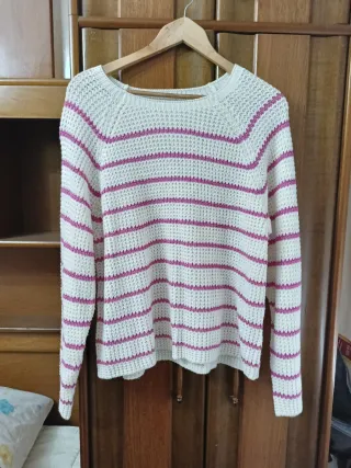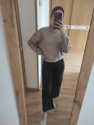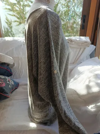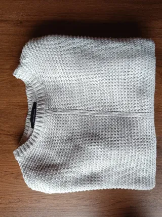 Jersey de punto grueso con cuello redondo. - Diseño de canalé. - Manga larga. - Bajo y puños elásticos. Lo compré y no me lo he puesto nunca, ha estado siempre guardado en el armario. El tejido es muy suave. Puse algunas medidas en las fotos. Hogar sin humos ni mascotas.