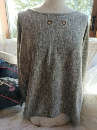 Jersey de punto fino en color gris verdoso Presenta un diseño moderno con dos ojales metálicos en la zona del escote. - Manga larga. - Cuello redondo. - Tejido suave y ligero.