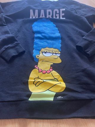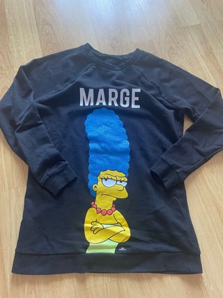 Sudadera negra con estampado de Marge Simpson. - Diseño con la frase MARGE en la parte superior. - Personaje de Marge Simpson con su característico peinado azul. - Cuello redondo y mangas largas.