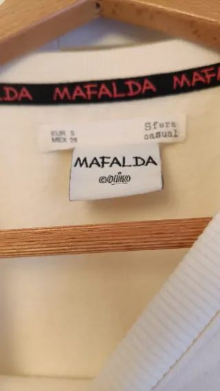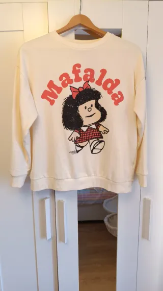 Sudadera con estampado de Mafalda, personaje icónico. - Diseño frontal con Mafalda y bloques. - Cuello redondo y manga larga. - Tejido suave y cómodo.