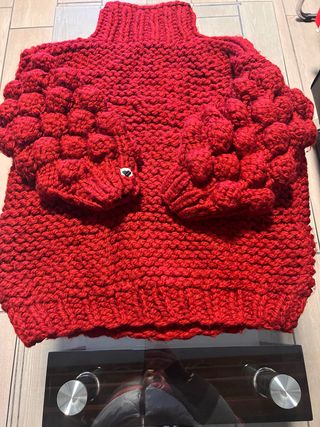 Jersey de punto fino en color blanco pastel con un diseño de lazo rojo en la parte delantera. Ideal para un toque dulce y femenino. - Tejido suave y ligero. - Manga larga. - Cuello redondo. -Talla S pero le puede quedar perfectamente a una de Talla M