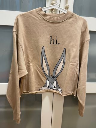 Sudadera corta de color beige con un divertido estampado de Bugs Bunny y la palabra hi.. - Diseño cropped. - Mangas largas. - Cuello redondo.