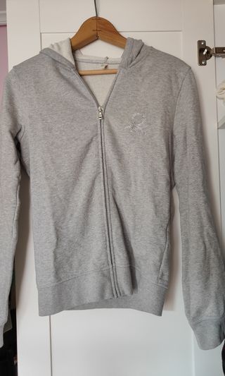 Sudadera con capucha y cremallera completa. - Diseño liso en color gris. - Bolsillos frontales con cremallera. - Puños y bajo elásticos. Nunca usada