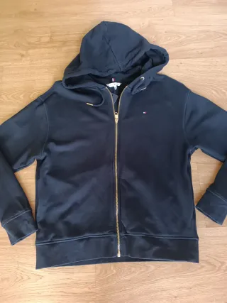 Sudadera con capucha y cremallera completa de Tommy Hilfiger. - Diseño clásico con logo. - Tejido suave y cómodo. - Cremallera dorada, bolsillos en los lados - Talla XS ( viene holgada) - Color azul marino ( el color es intenso, en la foto no se aprecia bien).