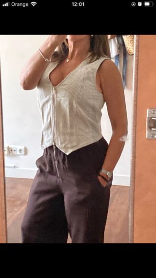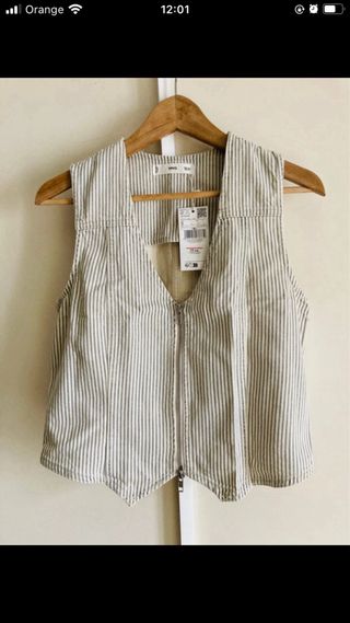 Chaleco con un diseño moderno y versátil. - Cierre frontal con cremallera doble. - Tejido a rayas verticales.