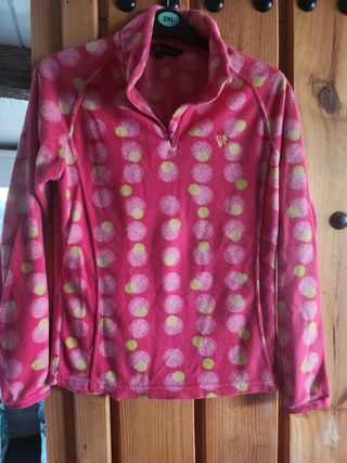 Sudadera polar con cremallera delantera, fondo de color fucsia y con estampado