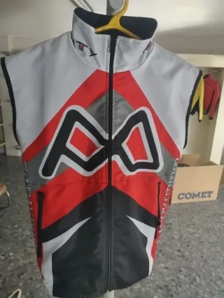 Chaleco sin mangas de la marca Monty. - Diseño con detalles en rojo, gris y blanco. - Cierre de cremallera frontal. - Cuello alto.