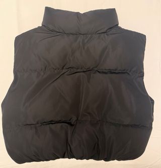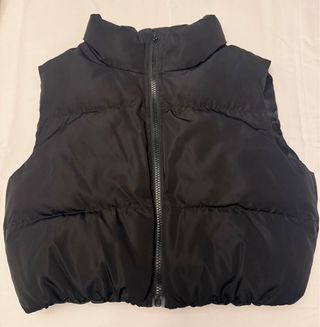 Chaleco corto acolchado con cuello alto y cierre de cremallera. - Diseño moderno y ligero. - Acolchado para mayor comodidad. - Cremallera frontal. - Nuevo, nunca se ha usado