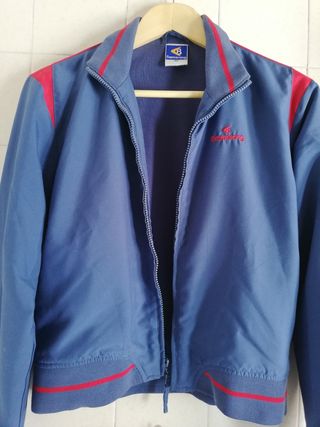 Sudadera azul con adornos en color rojo, de Bumerang. Es tipo cazadora con elástico en la cintura y puños. Tiene bolsillos y cierre de cremallera. T. 40.Está en perfecto estado.