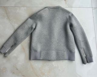 Sudadera gris de manga larga con detalles de rayas en las mangas. - Cuello alto con cremallera. - Puños y bajo elásticos. - Diseño cropped.