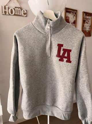 Sudadera gris con diseño deportivo y logo LA en el pecho. - Cremallera en el cuello. - Cuello alto. - Puños y bajo elásticos. - contraste en color granate. - nueva sin estrenar.