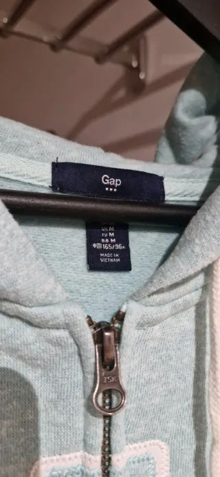 Sudadera con capucha y cremallera completa de la marca GAP. Es de color verde azulado y tiene el logo de la marca en el pecho. - Logo GAP bordado en contraste. - Bolsillo tipo canguro. - Puños y bajo elásticos.