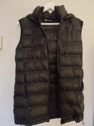 Chaleco acolchado con capucha de Zara. - Diseño sin mangas. - Cierre de cremallera frontal. - Bolsillos laterales con cremallera. - Cordón ajustable en el bajo.