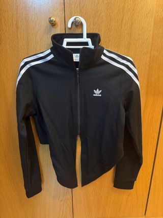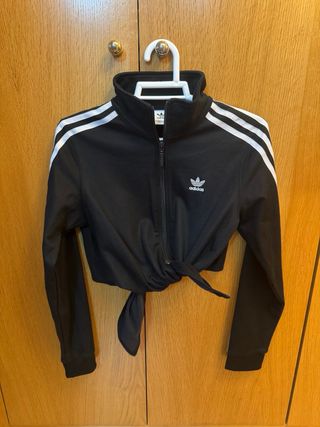 Chaqueta Adidas Originals negra con las clásicas tres bandas blancas en las mangas. Diseño corto (crop) con cierre de cremallera y detalle anudable en la parte delantera/trasera, muy favorecedor y versátil. Talla XS (equivale a 32-34). En muy buen estado, sin manchas, roturas ni desgaste apreciable. Tejido cómodo, ideal para looks deportivos o casual. Producto original Adidas. 📦 Envío disponible 🤝 Entrega en mano si se acuerda