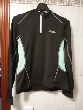 Sudadera deportiva para mujer de la marca Quechua. - Diseño con cuello alto y media cremallera. - Costuras decorativas en contraste. - Tejido elástico, cómodo y transpirable. En perfecto estado. Más artículos en mi perfil.