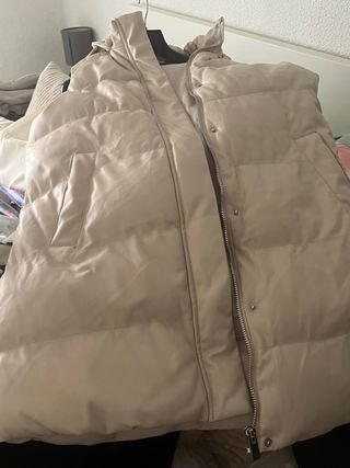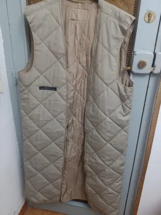 Chaleco largo acolchado de Zara, perfecto para añadir una capa extra de abrigo. - Diseño largo y acolchado. - Capucha integrada. - Cierre de cremallera frontal. - Bolsillos laterales con cremallera.