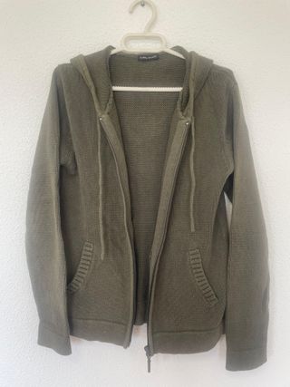 Cárdigan gordito en color verde caqui. Tiene dos bolsillos y capucha. Está como nuevo, solo que la cremallera hay que arreglarla. Talla S de Dunnes Store