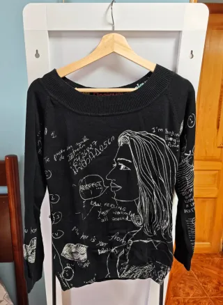 Jersey tipo lanita con estampado de cebra. Es talla L pero amplio y cede bastante. Esuy calentito. - Diseño llamativo en blanco y negro. - Cuello redondo. - Manga larga.