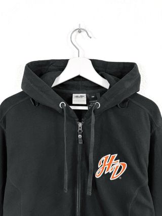 ⚡ Sudadera Harley Davidson con capucha y cremallera vintage de los años 2000. 🏷️ Talla 2XL de Mujer 📏 Medidas: 67cm de largo x 62cm de axilas 🎨 Color: Negro y naranja ✅ Estado: Muy bueno 🔎 Detalles: Logo bordado, tejido forro polar cálido, bolsillos laterales, cremallera completa, estilo motero clásico, estética vintage de los 2000