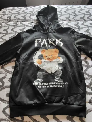 Sudadera con estampado de oso estilo Kung Fu y la palabra PARIS. - Diseño frontal con oso y texto. - Equivale a una L/XL