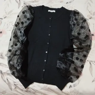 Rebeca de punto fino con mangas transparentes de tul con lunares. - Mangas abullonadas de tul con estampado de lunares. - Cierre de botones. - Puños y bajo de canalé.