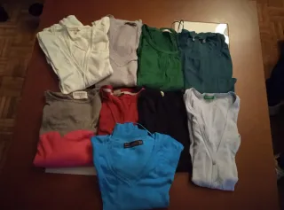 Conjunto de 9 prendas de ropa para chica, incluyendo jerseys y chaquetas. - Variedad de colores: blanco, gris, verde, azul, rojo, rosa, teal y negro. - Incluye diferentes estilos y diseños.