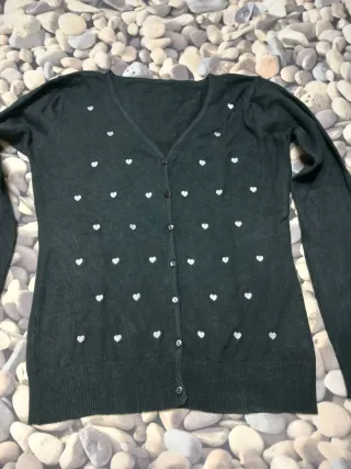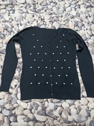 Rebeca de punto fino en color negro, con un bonito estampado de pequeños corazones plateados bordados por toda la parte delantera de la prenda. Cierre de botones. - Diseño con escote en pico. - Puños y bajo acanalados.
