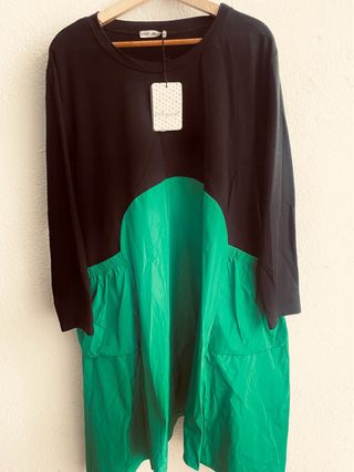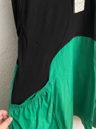 Vestido de dos tonos con un diseño moderno y práctico. - Parte superior negra de manga larga. - Parte inferior verde con dos grandes bolsillos. - Cintura elástica en la zona de los bolsillos. TEjido tipo sudadera la parte de arriba coordinado con la parte de abajo de elastano