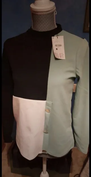 Jersey de Zara con un diseño moderno y elegante. - Combina tejido de punto con paneles de efecto piel. - Mangas largas. - Cuello redondo.