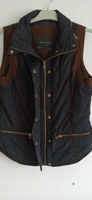 Chaleco acolchado marino de Zara con detalles en marrón. - Cierre de cremallera frontal. - Bolsillos con cremallera. - Cuello alto. - En el cuello va un gorro plegado cerrado con cremallera.