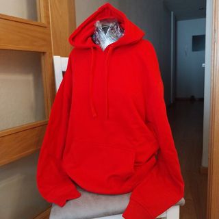 Sudadera con capucha de color naranja vibrante y detalles en negro. - Capucha integrada. - Dos bolsillos frontales con cremallera. - Puños y bajo elásticos.