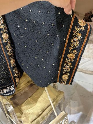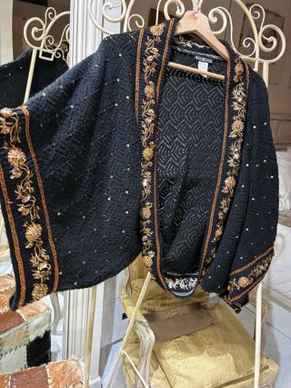 Elegante cárdigan de la marca BDBA, perfecto para añadir un toque sofisticado a tu atuendo. Mangas estilo kimono - Diseño de punto con detalles bordados. - Adornado con lentejuelas y abalorios. - Bordes decorados con motivos florales y dorados. sirve desde Talla XS hasta L.