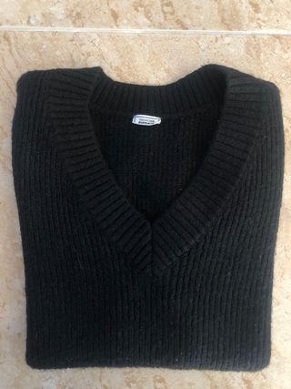 Chaleco de punto fino de Stradivarius con un diseño moderno y elegante. Talla S da talla que es amplio - Cuello en pico con ribete negro. - Bajo con doble ribete negro. - Sin mangas.