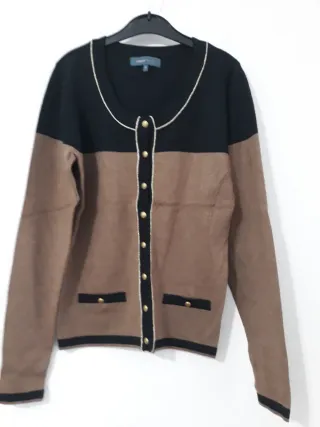 Cardigan de punto con diseño bicolor y detalles elegantes. - Cuello redondo. - Cierre de botones dorados. - Bolsillos frontales con solapa. - Ribetes decorativos en contraste.