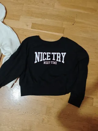 Sudadera gris, letras negras delante y espalda lisa. Sin bolsillos, cortita. Bien conservada.