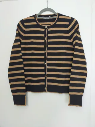 Cárdigan de punto con diseño de rayas horizontales. -Medidas 34 cm de espalda - 48 cm de axila a axila - 57 cm de largo - Cuello redondo. - Cierre de botones. - Puños y bajo de canalé.