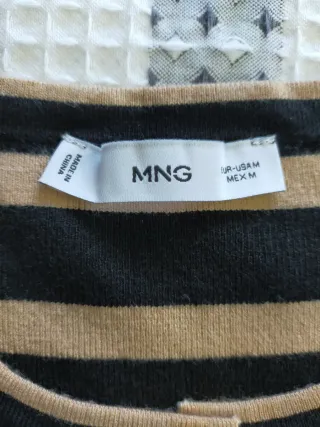 Jersey de punto con diseño de rayas horizontales. Es una prenda cómoda y versátil. - Diseño de rayas en beige y negro. - Cuello redondo. - Manga larga.