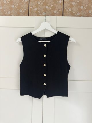 Elegante chaleco sin mangas de Zara. Presenta un diseño clásico con botones frontales. - Cierre de botones dorados. - Corte recto. - Tejido suave al tacto.