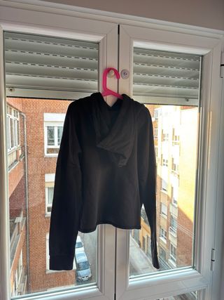 Sudadera con capucha de color negro. - Diseño con cordones ajustables. - Bolsillo frontal tipo canguroes una S grande o una M.