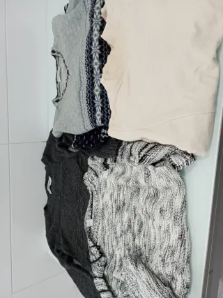 Conjunto de seis jerseys para mujer. - Jersey blanco y negro a rayas. - Jersey amarillo de punto fino. - Jersey azul de canalé. - Jersey beige de punto grueso. - Jersey rosa con trenzado. - Jersey amarillo de escote pico. - Se vende el lote de los 6 jersey todos por 25€. - No se hacen envíos. Serían para recoger en León capital.