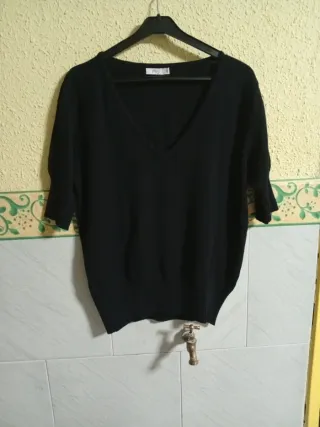 Jersey de punto fino en color negro. Tiene un favorecedor escote en pico y mangas cortas. - Tejido suave. - Corte holgado.