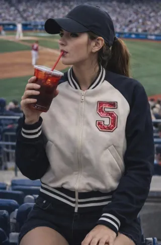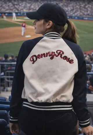Sudadera estilo bomber de Denny Rose. - Diseño bicolor en beige y negro. - Detalle de lentejuelas rojas en la espalda con el logo 'Denny Rose'. - Puños y cintura elásticos con rayas blancas.