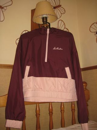 Chaqueta tipo cortavientos de la marca Hollister, con un diseño vintage. - Color granate con detalles en rosa. - Cremallera frontal. - Bolsillo canguro.