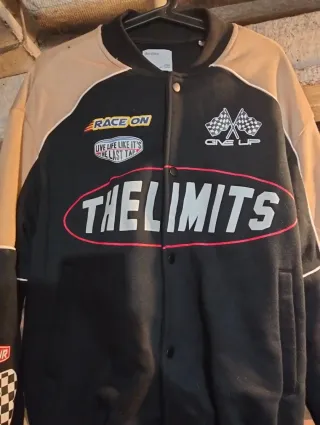 Sudadera estilo racing con un diseño llamativo. - Combinación de colores beige y negro. - Estampados temáticos de carreras. - Cierre de botones a presión. Está como nueva Hago envíos