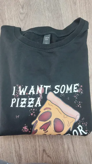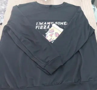 Sudadera negra con un divertido estampado. - Diseño I want some pizza & horror movies. - Ilustración de una porción de pizza con detalles. - Manga larga.