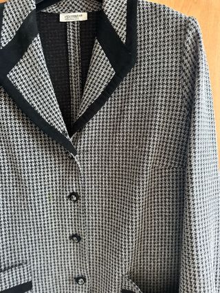 Chaqueta larga con estampado de pata de gallo en blanco y negro. Presenta un diseño elegante con solapas y bolsillos. - Cuello con detalle en contraste. - Cierre de botones. - Bolsillos frontales con ribete.
