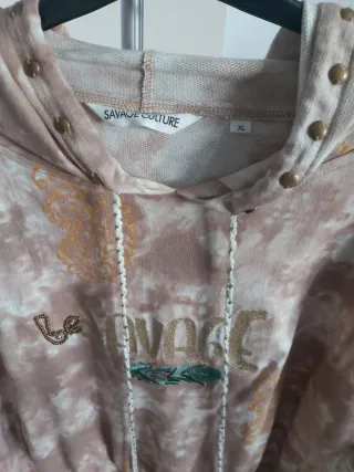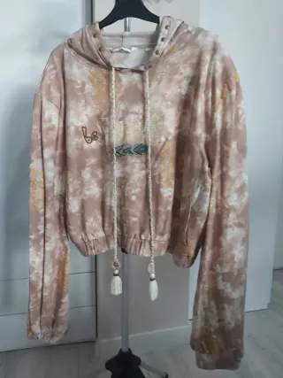 Sudadera con un diseño tie-dye en tonos beige y marrón. Presenta un estampado con detalles dorados. Capucha con cordones. Puños y bajo elásticos. Medidas aproximadas: Sisa 66 cm Cintura elastica. Largo 50 cm