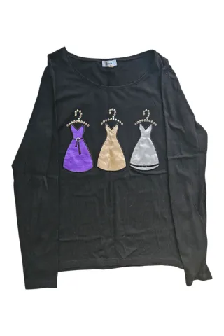 Sudadera negra de manga larga con un bonito estampado de vestidos. - Estampado de tres vestidos en diferentes colores: morado, dorado y plateado. - Cada vestido está adornado con pequeños detalles brillantes. - Cuello redondo y manga larga.