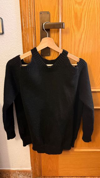 Jersey de punto negro con diseño moderno. - Corte con hombros descubiertos. - Tejido suave y cómodo.